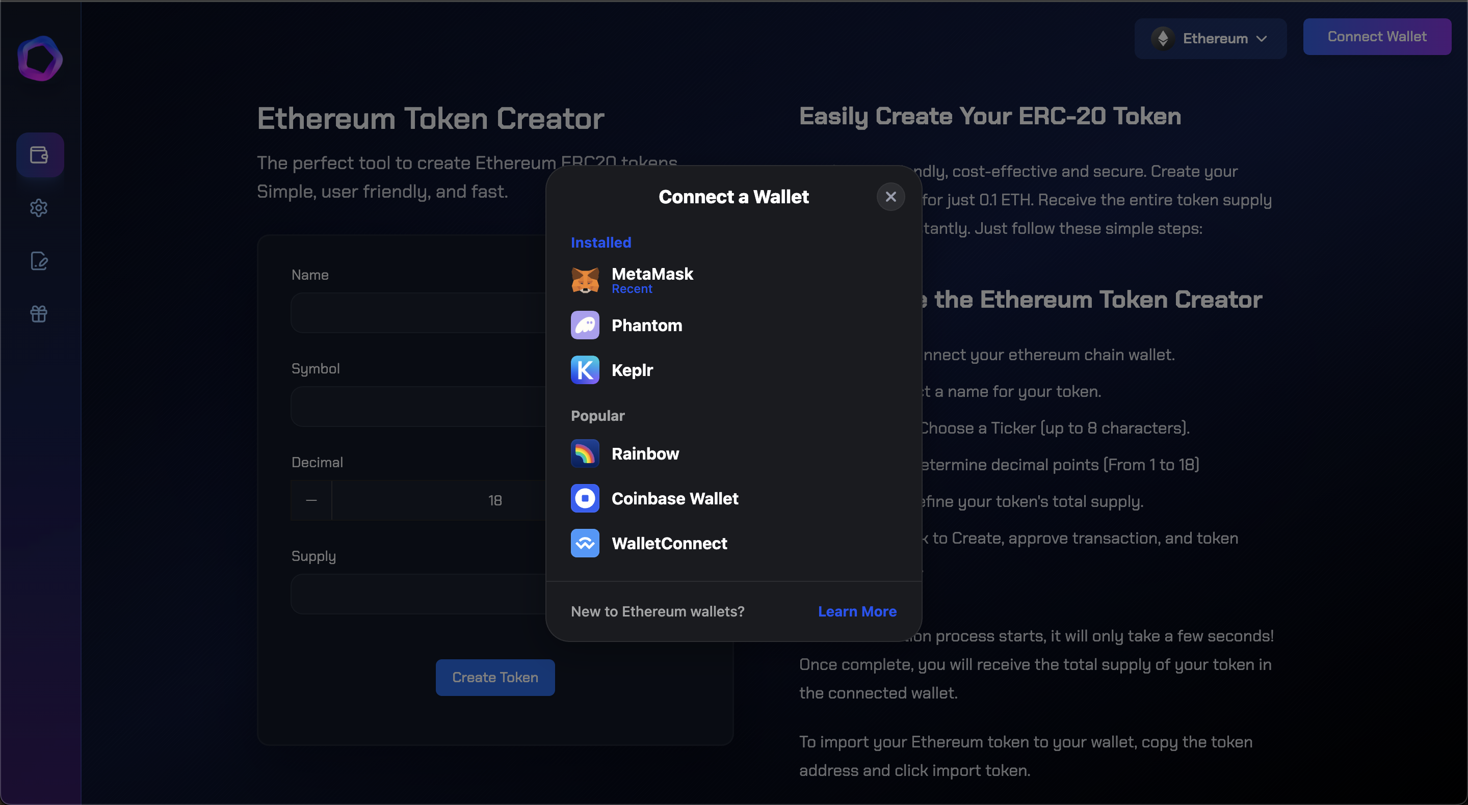 Enter Token Details: Input your token's name, symbol, total supply, and number of decimal places.